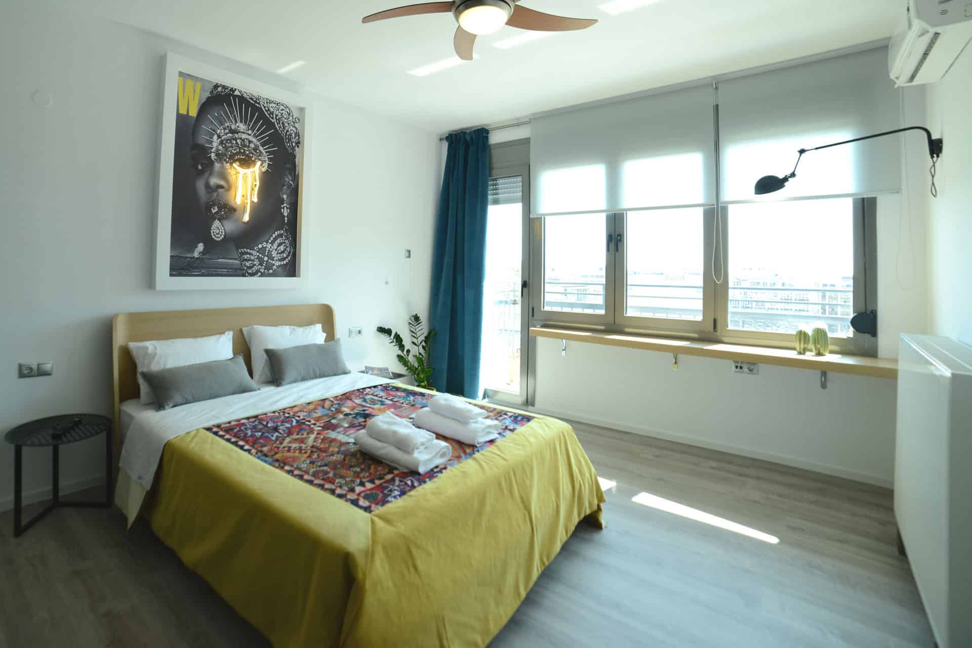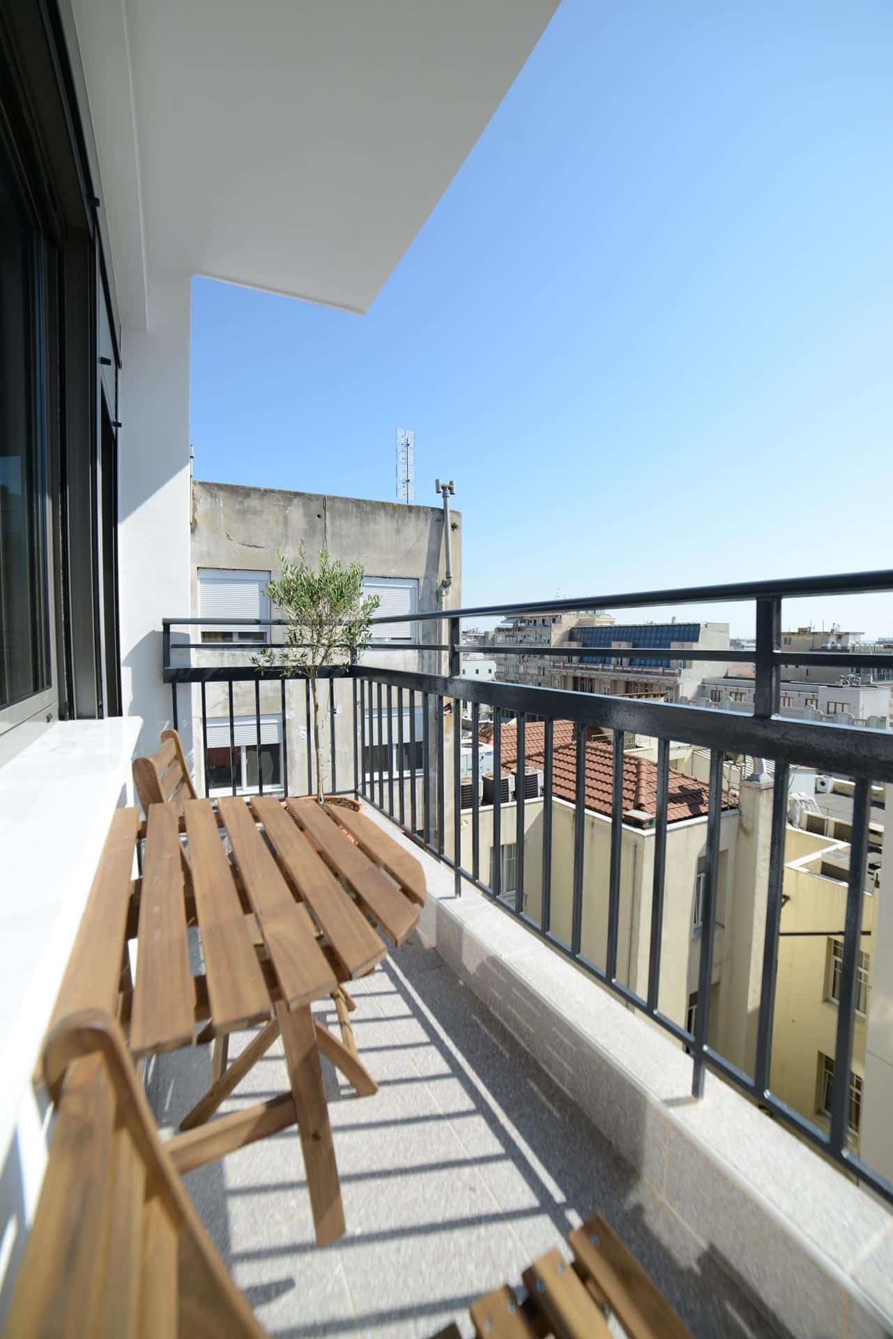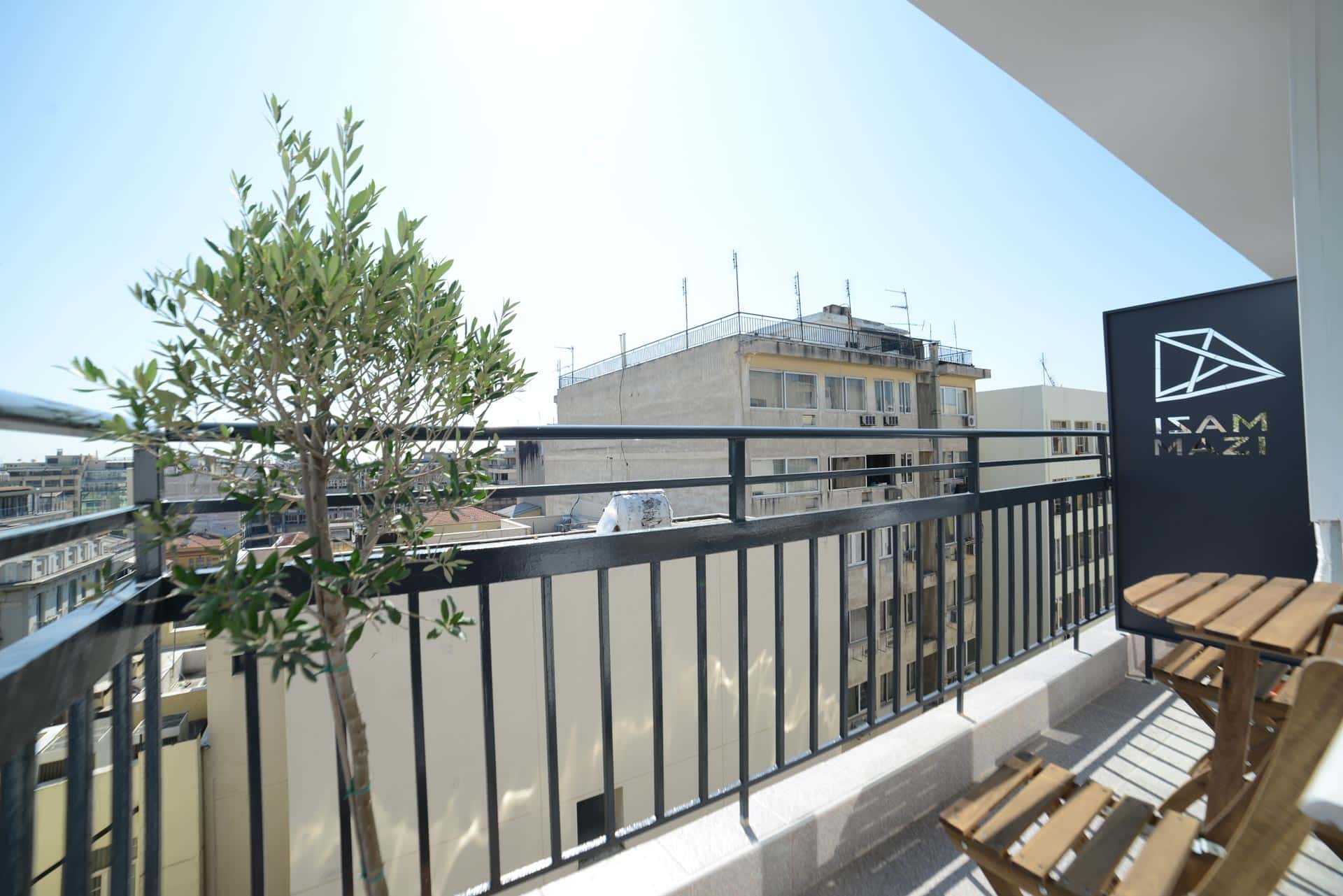 Mazi Rooms 7.3 is on the seventh floor in a block of apartments situated in the historical center which is accessible by stairs and elevator. It is a 40 sq meters studio apartment, where the queen size bed and the kitchen are in the same area. Beside the bed ,large windows have been designed so that a wood desk installed under them, is positioned to take advantage of the urban view, while upholstered cushions make the couch extra cozy and comfortable for daytime lounging. Just beside the kitchen is a spacious wardrobe equipped with blankets and all the necessary bed linen that cover every needs also includes a comfortable double-convertible sofa , a smart TV and coffee tables. AC and heating units have been installed for visitors’ comfort. Next to the living room there is a fully equipped kitchen that allows the visitor to prepare breakfast and main meal. A modern and comfortable bathroom with a glass enclosed shower offers hot water 24 hours a day, linen, towels, soap, shampoo and toilet paper are also provided. A lovely balcony with a great urban view is offered for breakfast and coffee.