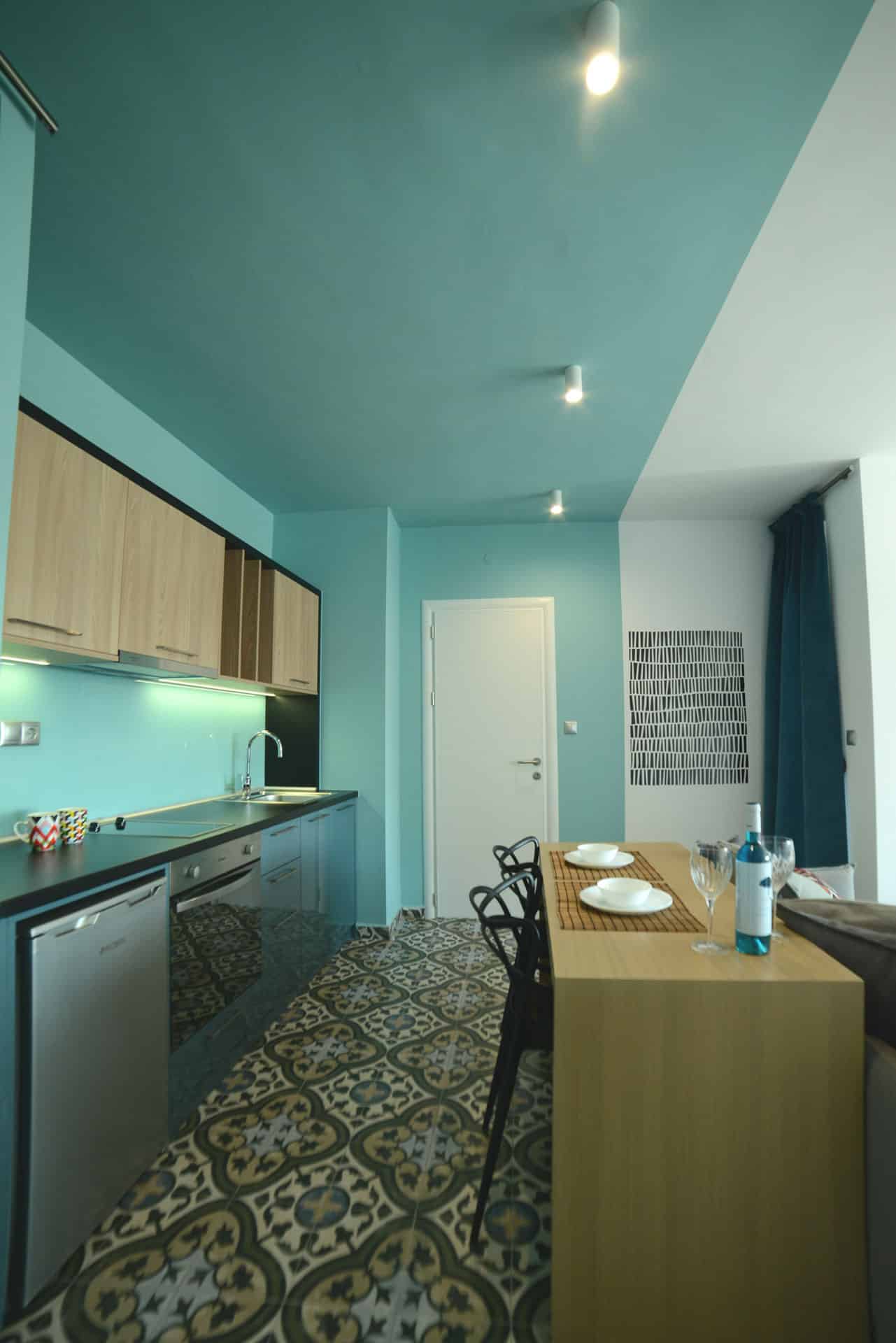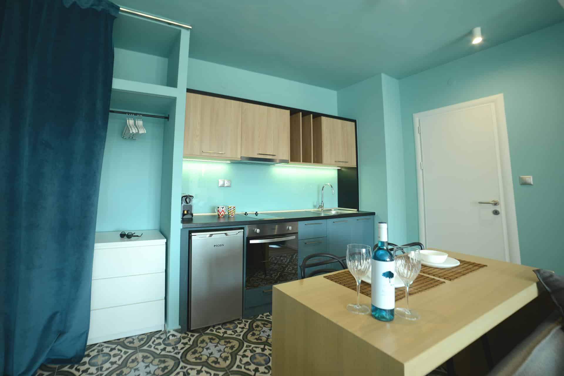 Mazi Rooms 7.3 apartment is recently renovated according to the standards of a modern, fully equipped, functional space which can accommodate two adults plus 1-2 children. The contemporary and open-concept room design is mostly white, but blocks of color and materials have been used to define various areas throughout the interior.