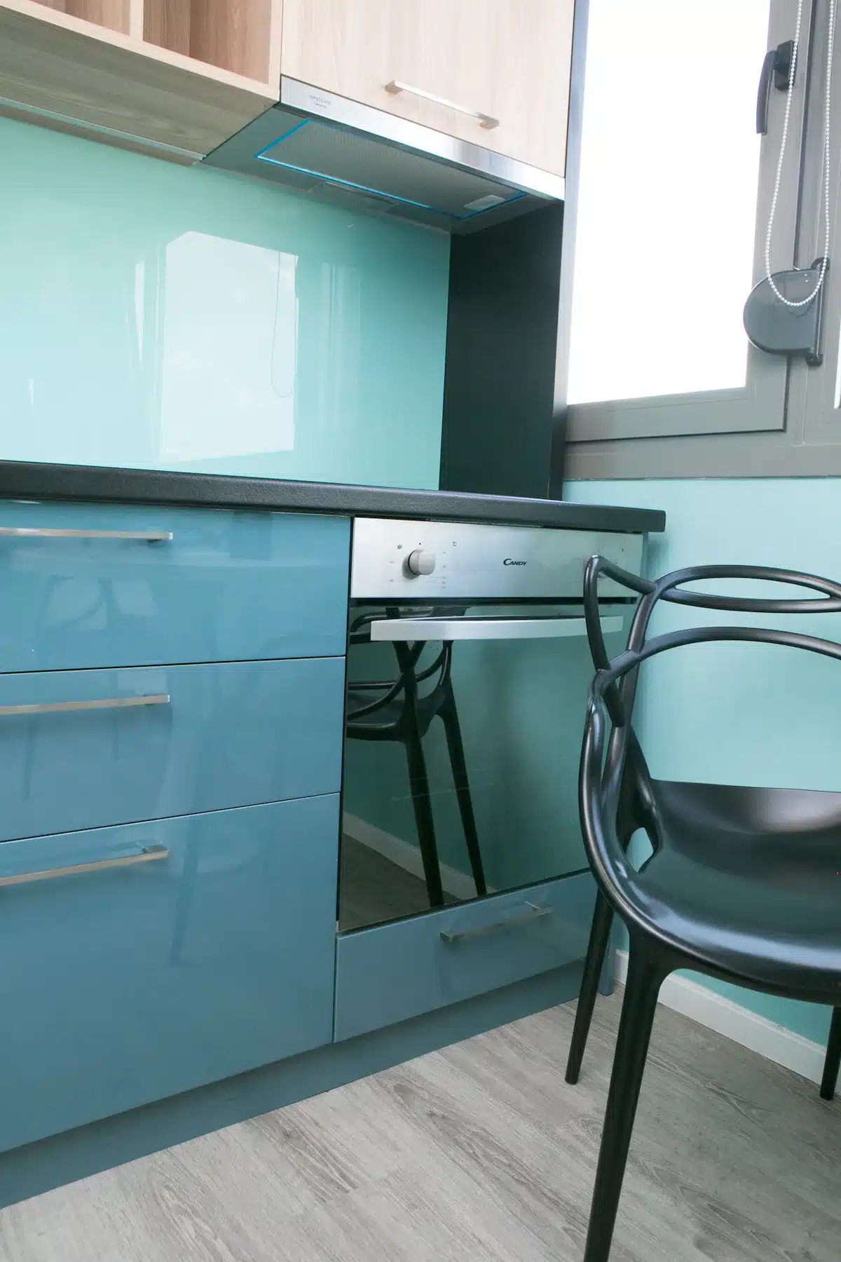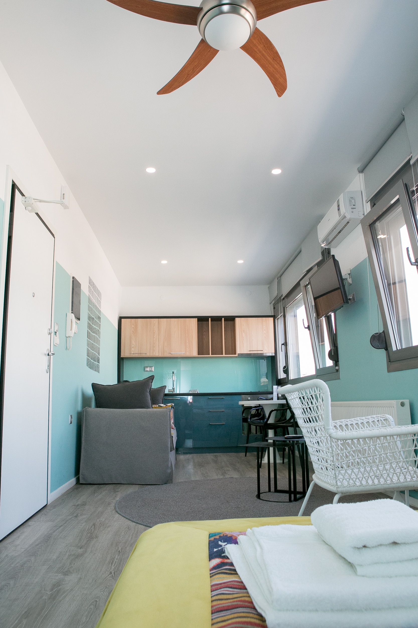 Mazi Rooms 7.1 is on the seventh floor in a block of apartments situated in the historical center which is accessible by stairs and elevator. It is a 35 sq. meters studio apartment, where the queen size bed is separated by the kitchen and the living room. Beside the bed ,large windows have been designed so that a wood desk installed under them, is positioned to take advantage of the urban view, while upholstered cushions make the couch extra cozy and comfortable for daytime lounging. On the other side of the bed is a spacious wardrobe equipped with blankets and all the necessary bed linen that cover every needs also includes a comfortable double-convertible sofa , a smart TV and coffee tables. AC and heating units have been installed for visitors’ comfort. Next to the living room there is a fully equipped kitchen that allows the visitor to prepare breakfast and main meal. A modern and comfortable bathroom with a glass enclosed shower offers hot water 24 hours a day, linen, towels, soap, shampoo and toilet paper are also provided.