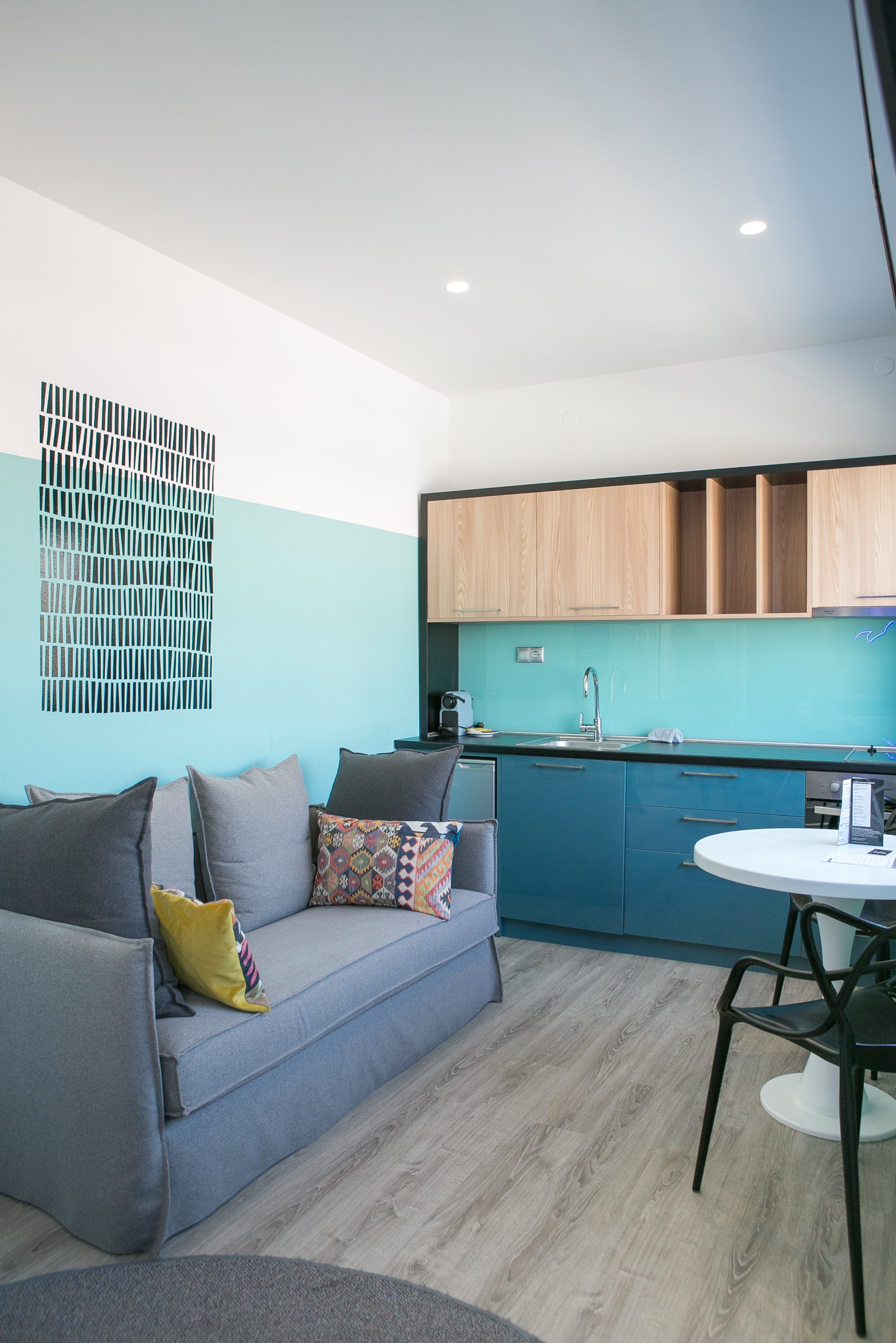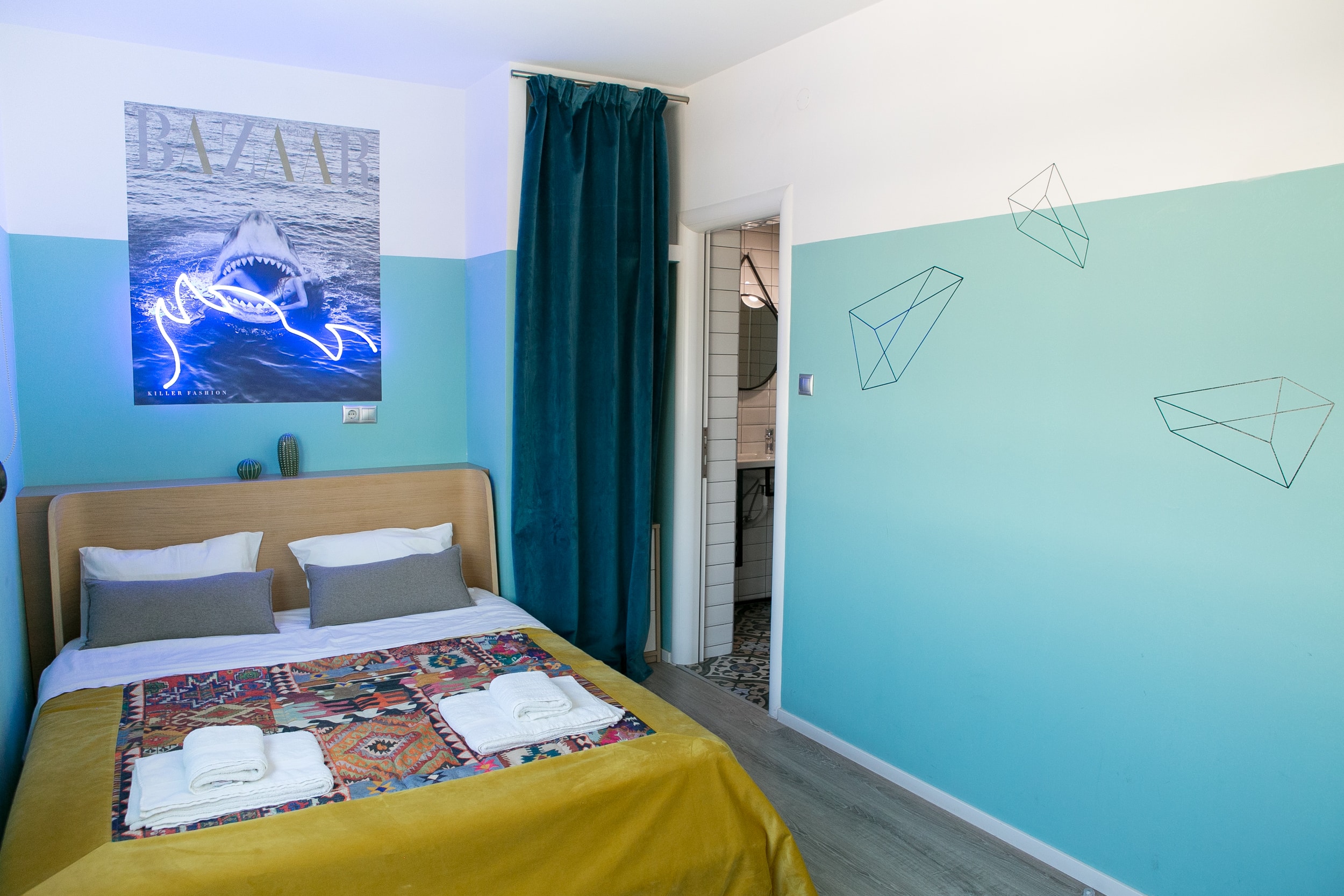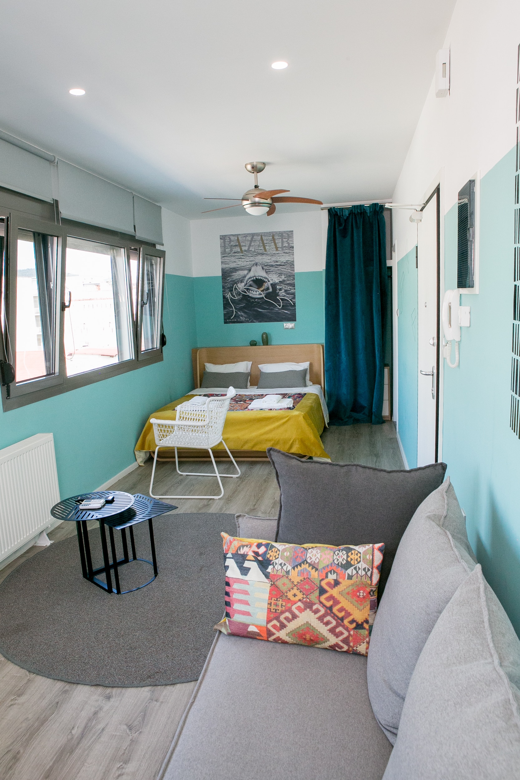 Mazi Rooms 7.1 apartment is recently renovated according to the standards of a modern, fully equipped, functional space which can accommodate two adults plus 1-2 children. The contemporary and open-concept room design is mostly white, but blocks of color and materials have been used to define various areas throughout the interior.